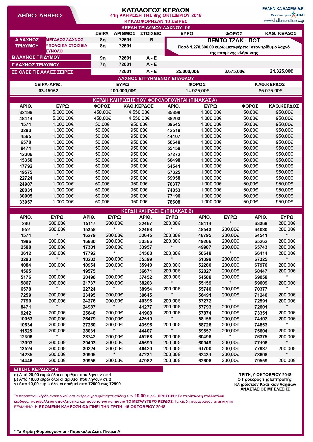 Ο μεγάλος λαχνός που κληρώθηκε στο λαικό λαχείο είναι: ΑΡΙΘΜΟΣ: 48972 – ΣΕΙΡΑ: 4η και ΤΥΧΕΡΟ ΣΤΟΙΧΕΙΟ: Γ.
